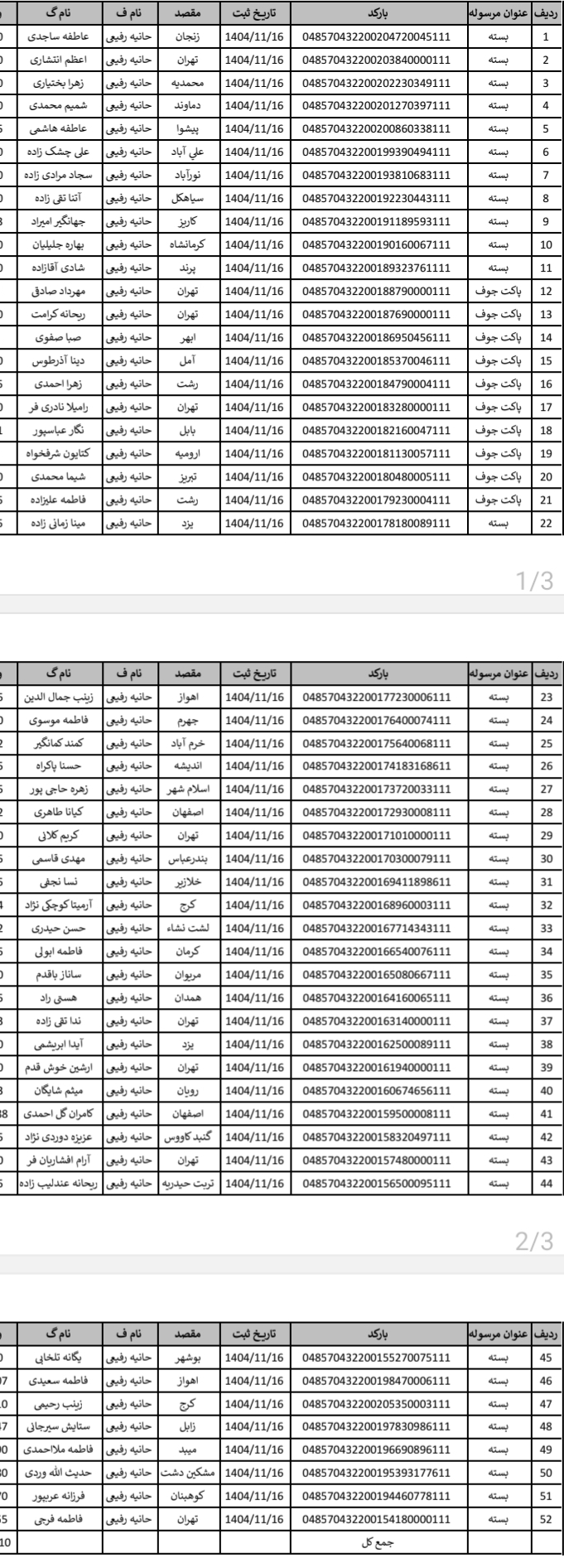 ارسالی های 16 بهمن ماه تاریخ: شنبه 18 بهمن 1404 - 12:42 نویسنده: مغازه صفحه: لیست روزانه ارسالی های جانا