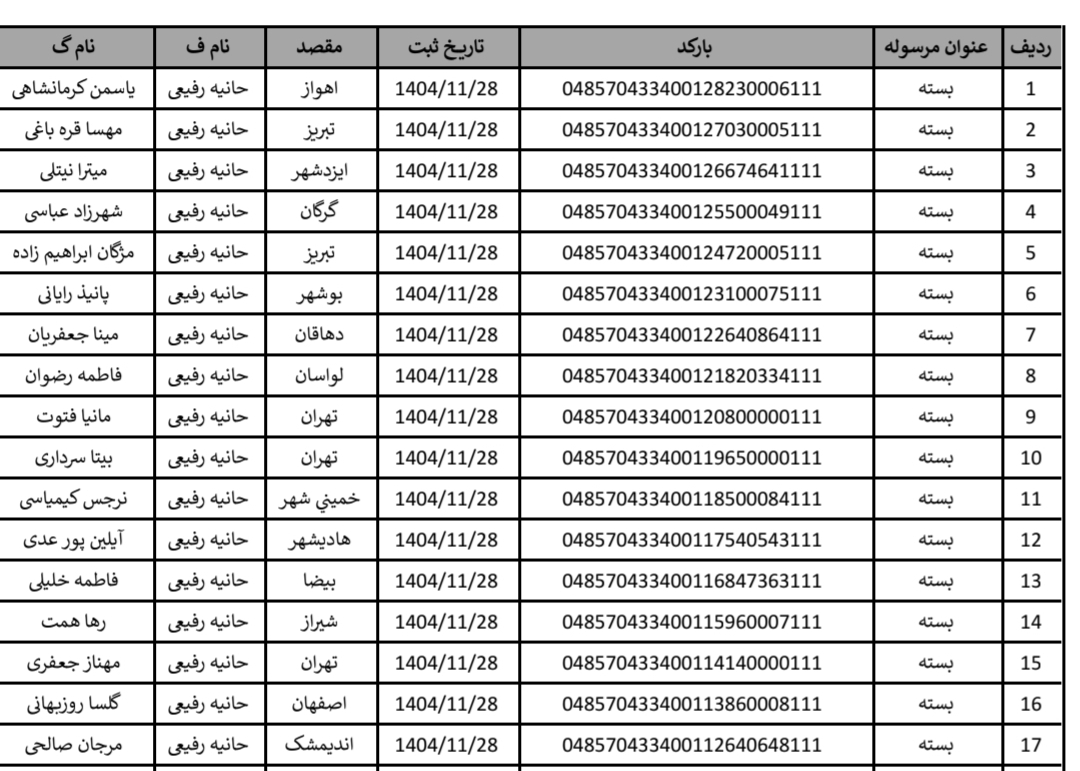 لیست ارسالی های 28 بهمن ماه تاریخ: چهارشنبه 29 بهمن 1404 - 11:17 نویسنده: مغازه صفحه: لیست روزانه ارسالی های جانا